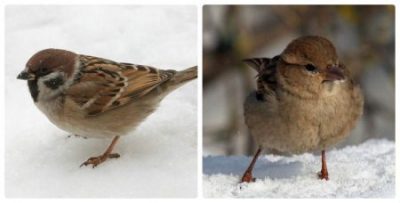 Основная отличительная особенность между видами заключается в различном цвете оперения на макушке. У полевого воробья он ярко-коричневый, а у домового темный бурый. В области шеи и головы полевых воробьев имеются темные вкрапления в виде пятен, а «воротник» окрашен белым. На крыльях домовых птиц красуется одна светлая полоса, в то время, как у полевых их две.