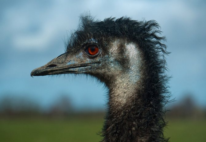 У эму плотное туловище продолговатой формы с опущенным хвостом. Маленькая голова на вытянутой шее бледно-голубого цвета. Глаза круглые по форме. Интересно, что их размер совпадает с величиной мозга птицы. Длинные ресницы делают особенным взгляд птицы.