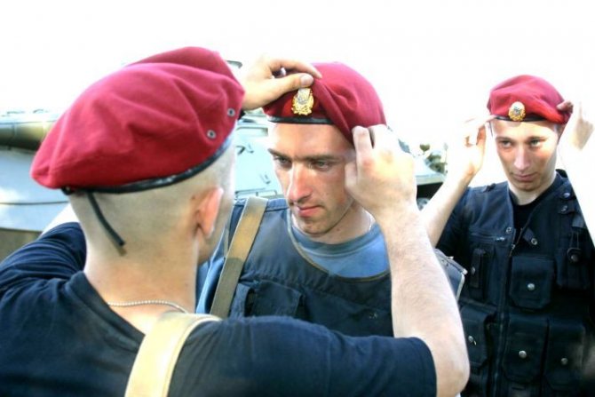 (Бойцы одесского ОМОНа на полигоне ВДВ в Болграде. Головные уборы – черные береты , 1989 год.)