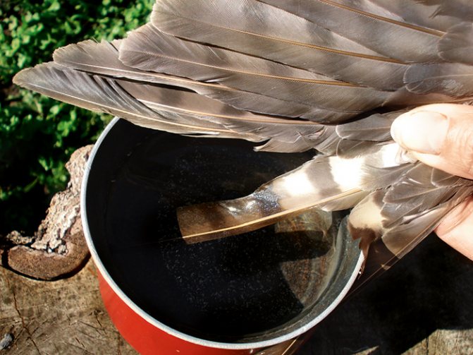 Отпаривание в горячей воде перегибов на перьях ловчих птиц