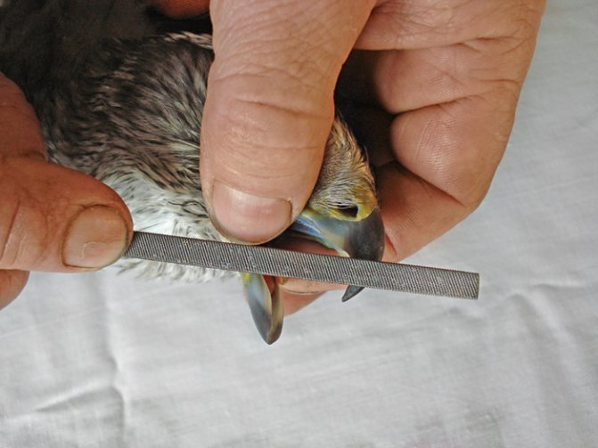 Когти ловчих птиц можно приводить в исходный вид, откусив отросшую часть кусачками для ногтей и аккуратно стачивая их с наружной стороны плоским надфилем. При такой процедуре я птицу пеленаю. Если хотите сделать идеальные, природные когти, посадите птицу часов на пять в клобучке в ванночку с теплой водой. Разбухнув, роговой слой при высыхании отвалится сам. Именно так, под влиянием дождя и влаги, когти и клюв «затачиваются» в природе. Эту процедуру нужно делать несколько дней в зависимости от того, насколько сильно они отросли. Может, будет достаточно двух дней, а может пяти, и когти у вашей птицы будут идеальные и острые, как иголки. Отросший клюв привожу в порядок, запеленав ловчую птицу. Откусив кусачками для ногтей до природной длины зубец, очень аккуратно стачиваю лишний роговой слой сверху и с боков клюва. Для стачивания применяю плоский треугольный и круглый надфили. При продолжительных дождях, в теплое время года, у содержащейся в саду птицы отросший клюв приобретает нормальный вид сам.