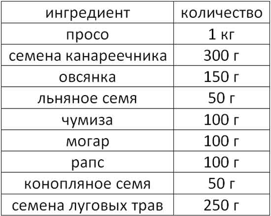 В день каждой птичке достаточно одной чайной ложки зерново-семенного корма. При излишке зерен и семян питомцы начнут набирать лишний вес, что чревато ухудшением их самочувствия. Чтобы сделать полезную смесь для кормления амадин, нужно правильно скомбинировать количество вышеописанных зерен и семян, что мы и сделали в этой таблице: