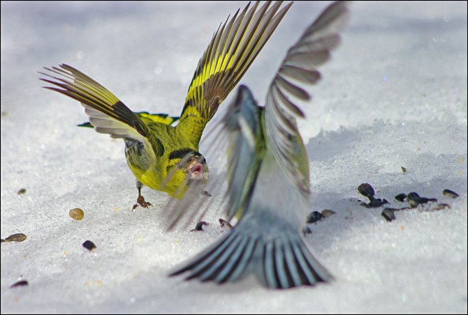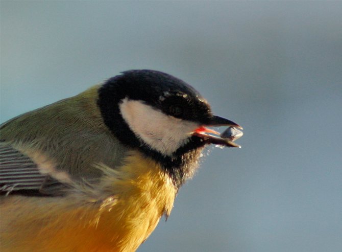 С наступлением холодов, синицы стараются селиться ближе к человеку. Так им проще добывать для себя пропитание. А едят они довольно часто и много.