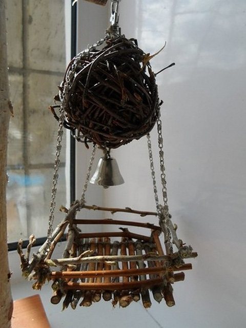 - Сплетите из веток шарики и подвесьте их с помощью проволоки к крыше клетки. Получились оригинальные игрушки и нужные погрызушки. Птицы не только точат свои клювы о дерево, но и пополняют запас полезных витаминов.