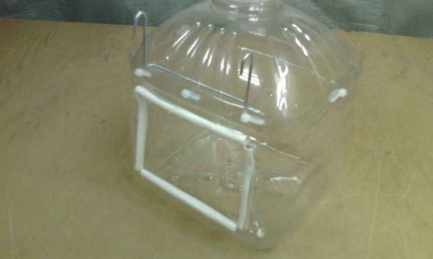 - Если купалку планируется подвешивать к клетке- необходимы крючки. Для их изготовления бутыль прокалывается в двух местах выше входа. В эти отверстия продевается проволока таким образом, чтобы концы торчали наружу. Их нужно загнуть кверху и вниз, в виде крючков на концах.