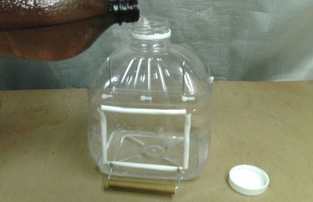 - Заливать и спускать воду вы будете через горлышко в исходной таре, которое сейчас служит крышей.