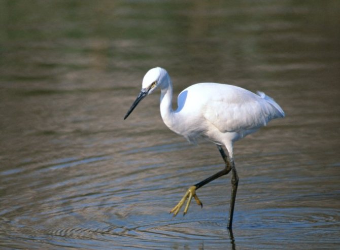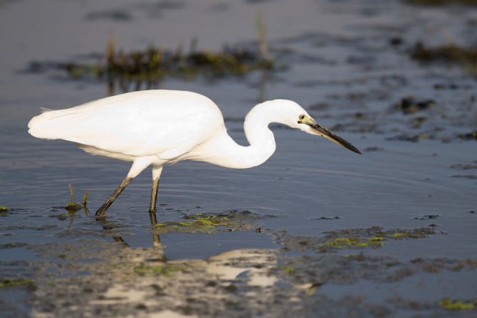 Оперение чисто белое, клюв и ноги черные, пальцы у взрослых птиц желтые. В брачном наряде на затылке видна «коса» из удлиненных ланцетовидных перьев. На зобу также имеются удлиненные узкие перья. На спине перья длиной до 24 см, слегка загнуты кверху. Такие перья на спине могут заходить за конец хвоста. Полет легкий, чем, с большей частотой взмахов крыльями, чем у большой белой цапли. Малые белые цапли широко распространены в Восточном полушарии. На зимовку птицы, обитающие в Западнйо и Центрально Европе, летят через Балканы, Италию и Сицилию в западные части тропической Африки. Главные места зимовки -Средиземноморье, тропическая Африка, Ближний Восток, Закавказье, побережья Персидского залива и Юго-Восточная Азия. Описаны темные морфы; они встречаются в тропиках, однако изредка залетают на территорию Европы.
