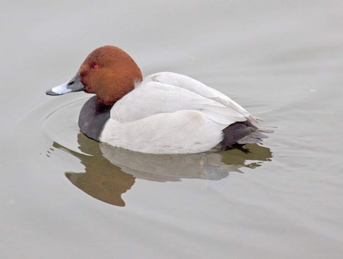Селезень: его трудно перепутать с уткой другого вида. У американского ныряльщика не красные, а жёлтые глаза, а королевский ныряльщик намного крупнее и тяжелее.