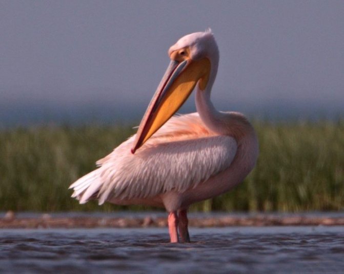 Розовый пеликан – это сравнительно небольшая птица. Длина крыльев самца составляет около семидесяти сантиметров, у самки немного меньше. Оперение обоих имеет бледно-розовый оттенок, у молодняка серо-бурый. Оттенок взрослой птицы они приобретают к трём годам жизни, когда становятся половозрелыми особями. Питаются рыбой, опуская свои длинные шеи в воду.