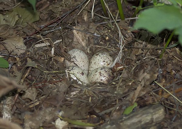 Гнездо представляет собой ямку или углубление в земле. Иногда его можно увидеть не только в зарослях, но и около лежащего дерева, находящиеся не так уж и близко к воде. В кладке обычно по 4 яйца размером в 3,5 см. Их окрас варьируется от зеленовато-белого до охристо белого цвета. Узорами яйца являются пятна с темно-серыми основными и красновато-бурыми поверхностными пятнами.