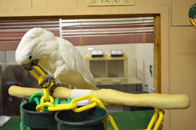 Чтобы попугай какаду был здоров и отлично себя чувствовал, за ним нужно ежедневно ухаживать. Причем уход за птицей в основном заключается в уходе за её жилищем. Клетку убирать и мыть нужно каждый день, удаляя скоропортящиеся продукты, остатки пищи, экскременты питомца. Зерновую смесь, которая не портится быстро, можно не выбрасывать, а оставить. Обязательно ежедневно мыть, а затем насухо вытирать кормушку и поилку.