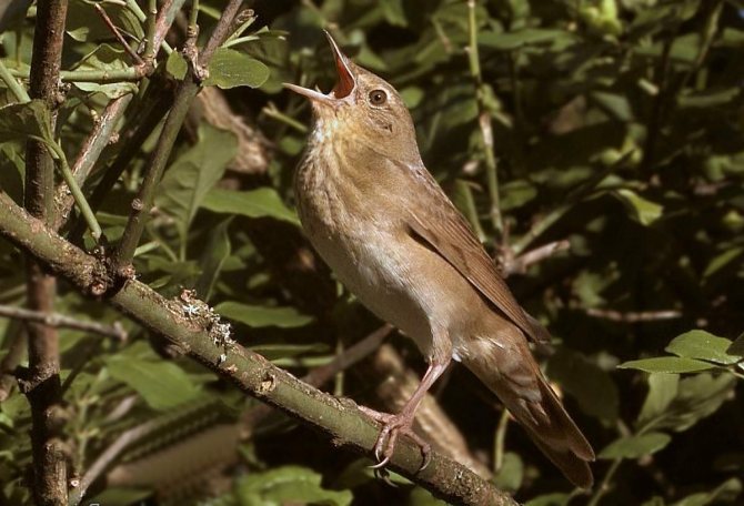 Некоторые пернатые солисты поют свои песни только ночью, начинается сольное выступление около 9 часов вечера и продолжается в общем птичьем хоре до половины ночи. С наступлением темноты умолкает птичье многоголосье, но с первыми лучами солнца концерт возобновляется до восхода. Особенно громко звучат трели в теплую и пасмурную погоду, доставляя любителям птиц настоящее наслаждение. В брачный период самцы издают стрекочущие звуки подобно насекомым с одноименным названием.