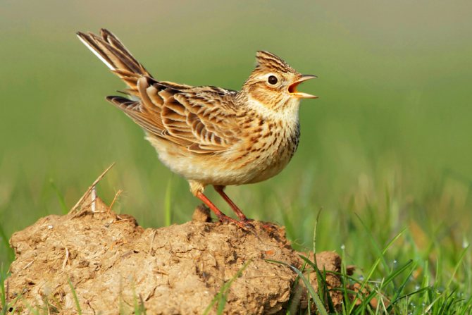 Жаворонок полевой обладает светло-бурым окрасом, который позволяет ему оставаться практически невидимым среди зарослей сухой травы. Самцы жаворонков крупнее чем самки. На голове – небольшой завернутый хохолок. Луга, поля и степи – естественная зона обитания жаворонка. Среди густых деревьев его не найти.