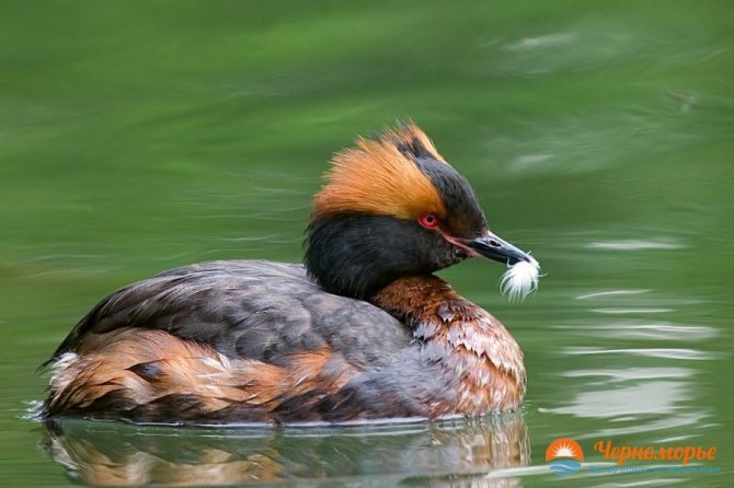 Она же большая поганка. Птица размером с утку, с изящной шеей и прямым клювом, окрашенная в три тона – белый, рыжий и черный. Брачный наряд чомги дополняется рыжим «ожерельем» и парой тёмных перьевых пучков на голове.