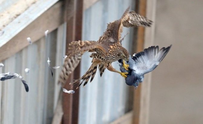 Стоит отметить, что ястребы представляют угрозу в основном диким голубям. Городским собратьям этих птиц угрожает сокол-сапсан. Этот сильный и грациозный хищник не боится залетать в город, для того, чтобы поохотиться на местных сизарей. Более того, в современных условиях сапсаны вскармливают своих птенцов в основном голубиным мясом.