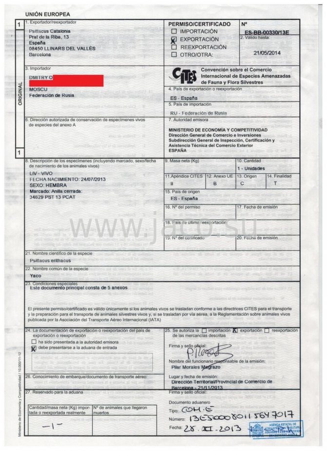 Птенцы жако из питомника, продажа попугаев, ПИТОМНИК ЖАКО, продаю жако из Чехии, жако из Германии, питомник Европы — наверное ни раз вы встречали подобного рода объявления. Если Вам при продаже птенца говорят что попугай из элитных питомников Европы Чехии и Германии или привезены в РФ из других стран, то ТРЕБУЙТЕ документы: 1) Международный документ Cites на вывоз из страны. 2) Международный документ Cites на ввоз в Россию. 3) Копию ветеринарного сертификата на экспортируемых на таможенную территорию Таможенного союза Республики Беларусь, Республики Казахстана и Российской Федерации, попугаев жако (от страны экспортера). 4) Оригинал Ветеринарного сертификата (оформляется ветслужбой аэропорта при въезде). 5) Анализы на: сальмонеллез, орнитоз, болезнь Ньюкасла, птичий грипп, гельминтоз. Внимание: данные анализы предоставляет страна отправитель и страна, в которой пройден карантин! Соответственно вам обязаны предоставить результаты анализов двух разных государств. 6) Разрешение Россельхознадзора на ввоз попугаев в Российскую Федерацию. 7) Продавец должен быть зарегистрирован в электронной системе «Аргус». (Государственный ветеринарный надзор для граждан России, Беларуссии и Казахстана). Без регистрации в Аргус, невозможно ввести птицу из-за границы. ВНИМАНИЕ: отсутствие у продавца хотя бы одного из документов, говорит о том, что вас обманывают!
