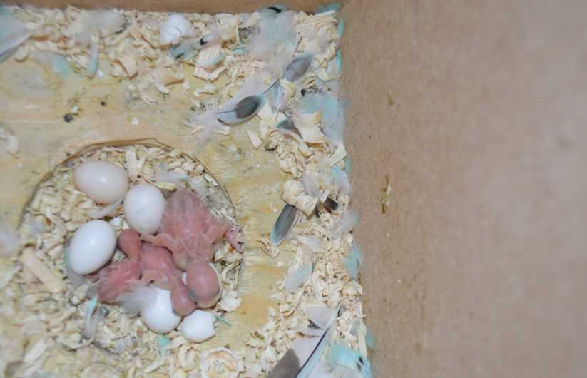 После появления птенчиков на свет, веточки можно заменить опилками. Каждый день заглядываете в гнездо, и смотрите, что бы птенчики не все время лежали в одном положении (после 7-8 дней) (только на спине или только на животе), а так же что бы пол у гнезда всегда был покрыт опилками или ветками. Плоский, скользкий пол приводит к патологиям у птенцов.