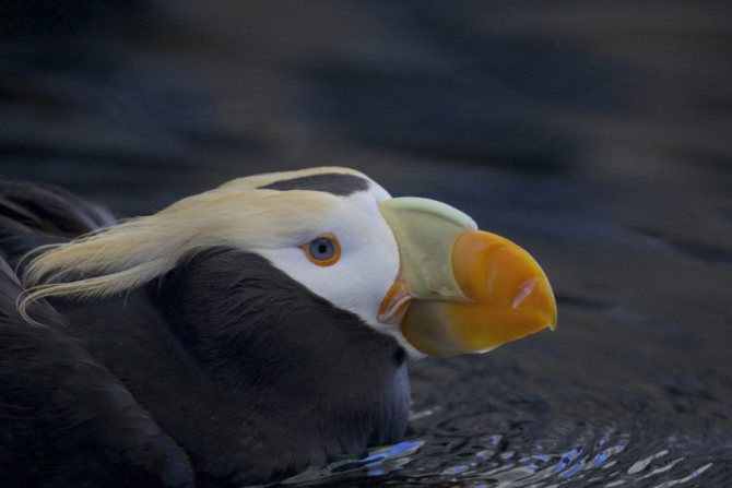 - Конюги – самые маленькие представители семейства, длина тела до 25 см. Бывают большие и малые конюги, а также конюги-крошки и белобрюшки. Окрас не контрастный, а в серых тонах. Спина темная, брюхо светлее. Интереснее всего выглядят в брачный период. Клюв становится ярко-оранжевым или красным, над ним появляются черные хохолки, а сбоку от глаз по вискам идут белые косички из перьев. Учитывая, что у них и глаза в белой каемке, как бусинки, всё вместе выглядит очень нарядно. Живет в северных тихоокеанских водах.