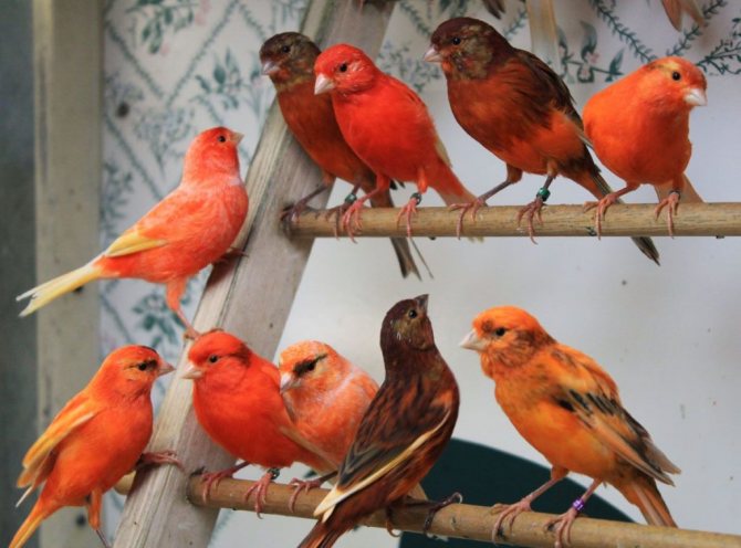 Ученые постарались скрестить канарейку с огненным чижом и получили красных птиц. Селекционеры вывели разные причудливые формы с хохолками на голове и завитками. Траектория полета у них аналогична с вьюрками, напоминающем картину волнения морских волн.
