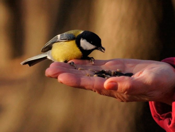 Большая синица очень веселая и подвижная птичка. Она довольно быстро привыкает к людям. Поэтому насыпая в кормушку лакомство, можно даже понаблюдать за ее поведением с близкого расстояния.