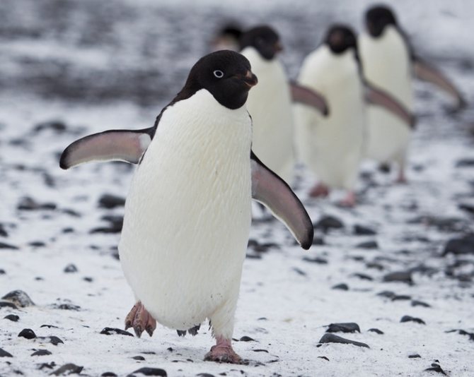 По рыхлому снегу представители семейства Spheniscidae предпочитают передвигаться на животе, чтобы не проваливаться. В этот момент они очень напоминают тюленей или других ластоногих и меньше всего похожи на своих настоящих крылатых родственников.