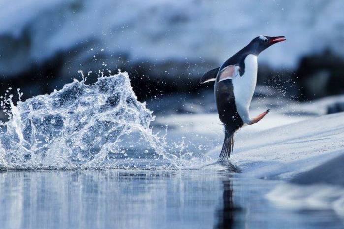 Быстро плавающие пингвины, как и дельфины или морские котики, выскакивают из воды. А в Антарктике спасающиеся от хищников пингвины, набрав скорость, запросто выскакивают на высокий ледовый припай.