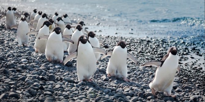Летать они не умеют, так что путешествуют пешком или ползком на брюхе, причем довольно быстро – со скоростью до 6 км/ч. На берегу самцы строят небольшие каменные гнезда, а самки откладывают в них по два яйца. В декабре лед тает, и пингвины вновь оказываются у самой воды.