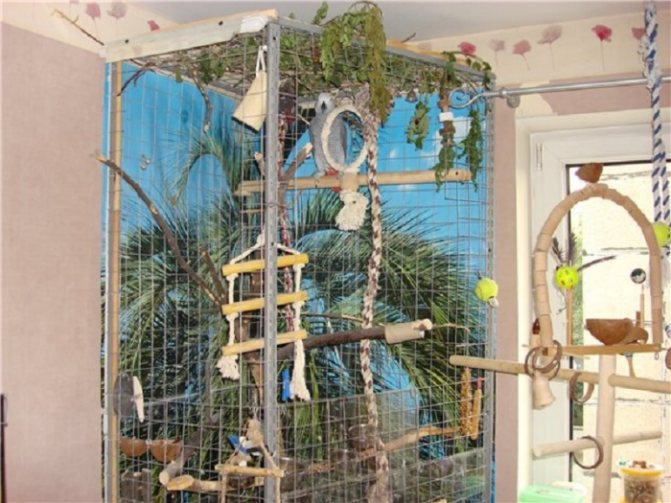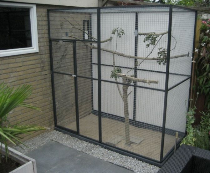 Совет! Чтобы попугаи не пострадали от незваных гостей, вольер лучше оградить двумя видами сетки.