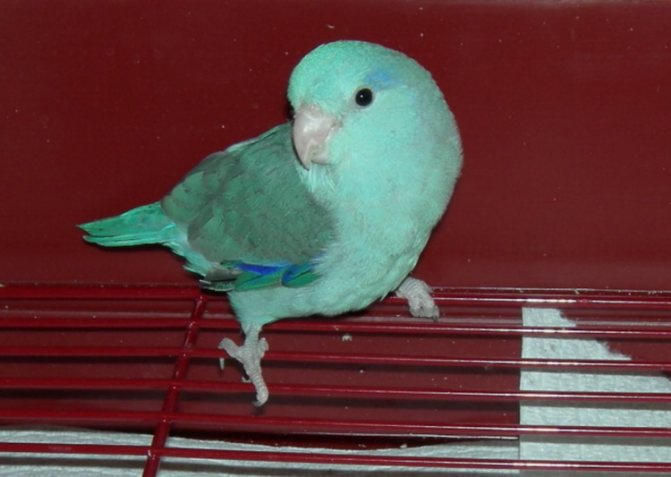Размеры этой крохи – 10-12 см в длину и вес 31-34 грамма. Латинское название — Forpus coelestis. Окрас самца – ярко зеленые (цвета зеленого яблока) лоб, темя и щеки, серебристо-голубой затылок и полоска с затылка до глаз. Нижняя часть спины, крестца, нижняя часть крыла и «подмышками» – сине-кобальтового цвета. Верхняя часть спины и крыльев – зеленовато-серого цвета. Клюв – бело-розового цвета. Лапки – розовые. Глаза – темно-коричневые. Окрас самки отличается тем, что там, где у самца сине-кобальтовые перья, у нее зеленовато-бирюзовые перышки. Кроме естественного окраса существуют цветовые мутации.