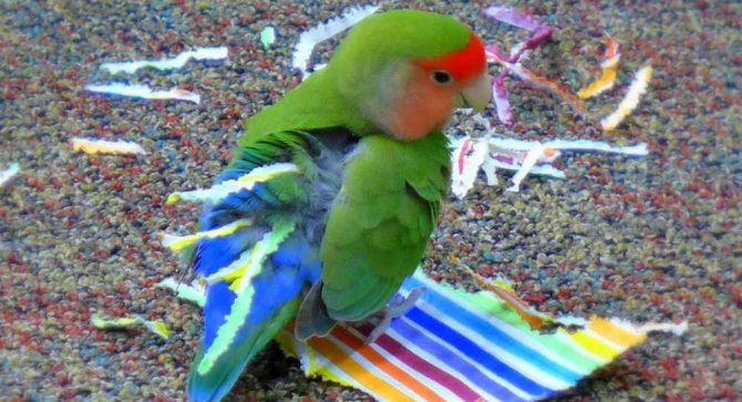 Чаще всего такое поведение можно заметить за попугаями-неразлучниками. Птица находит лист бумаги и аккуратно выстригает из него клювом полоски. Они могут быть длиной с попугайчика. Дальше самое интересное. Вырезанную полоску птица вставляет себе в хвост. Работа продолжается, птаха трудится, как раб на галерах, стрижет новые и новые полоски. Все они аккуратно вставляются между перьев хвоста, пристраиваются к пояснице.
