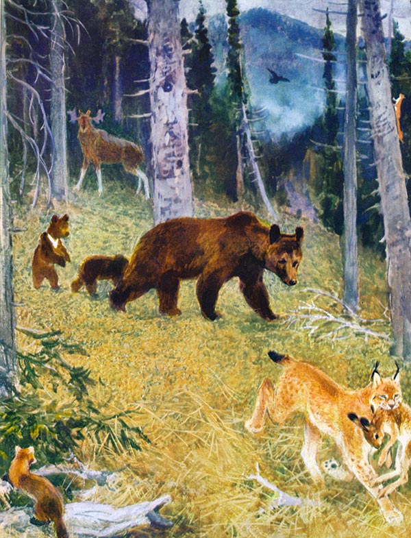 Животные тайги: на переднем плане слева: — соболь, справа — рысь, поймавшая зайца-беляка; в центре — бурая медведицах медвежатами; вдали — лось; справа на дереве — белка; над тайгой летит глухарь.