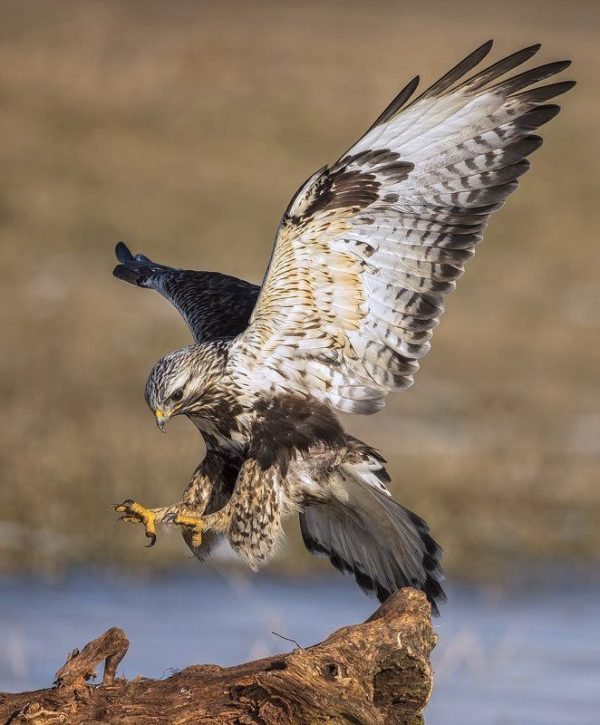 Некоторые птицы издали кажутся чёрно-белыми, пегими. От канюка отличается также более длинными хвостом и крыльями и в целом более светлым оперением без заметных рыже-каштановых тонов. Крылья снизу более контрастные. От курганника, помимо окраски корпуса и хвоста, отличается, наоборот, немного более короткими крыльями и хвостом.